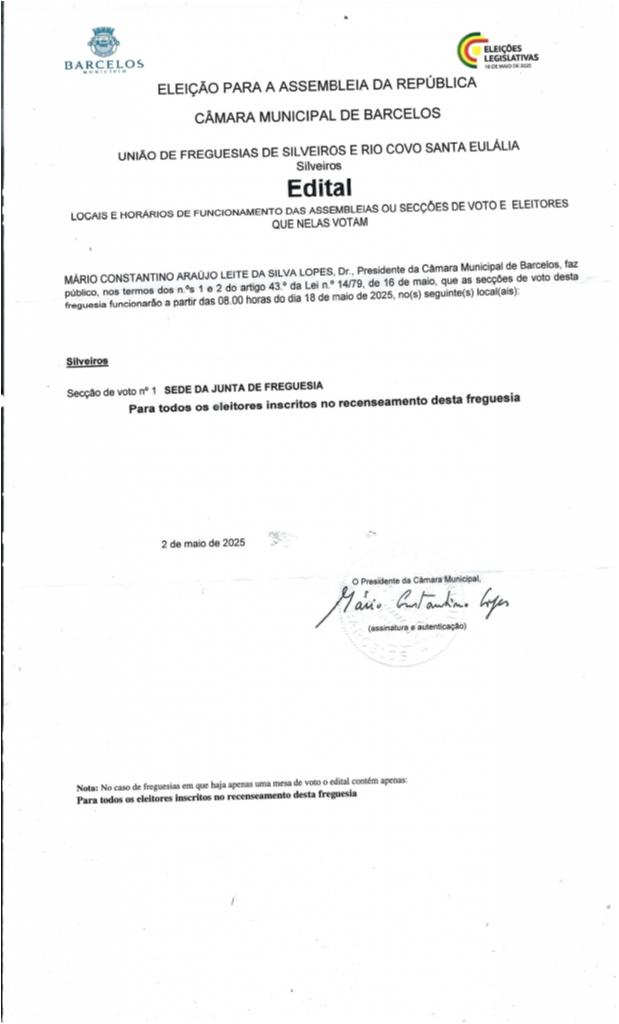 Segue-se a informação relativa aos locais e horário de funcionamento das secções de voto para as Eleições da Assembleia da República